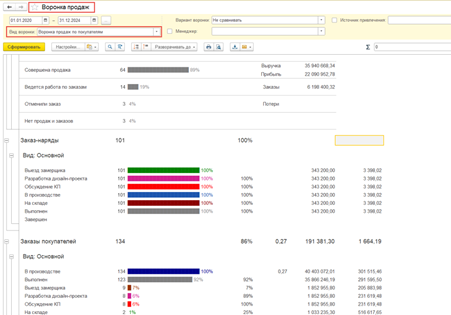 Так же блок позволяет формировать разные отчеты, такие как Воронка Продаж