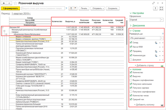 - отчёты по запасам: анализировать остатки, движение товаров, их стоимость и количество.
