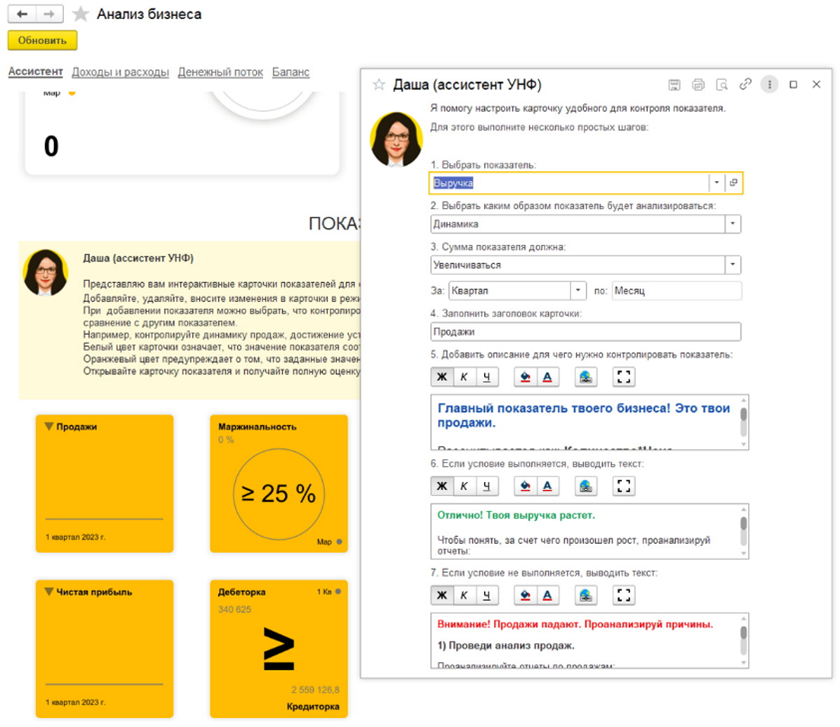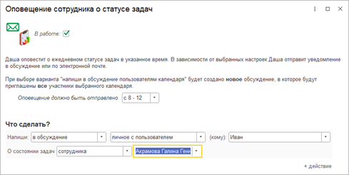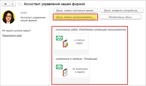 В версии 1С:Управление нашей фирмой 3.0.12, выпущенной 24 июня 2025 года, Даша получила новые навыки: сбор статистики по статусам задач сотрудников и информирование об изменениях в задачах.