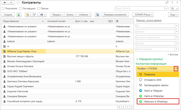 Перейдите в справочник "Контрагенты" или в карточку контрагента. Справа от поля "Телефон" в контекстном меню выберите вариант "Написать в WhatsApp".