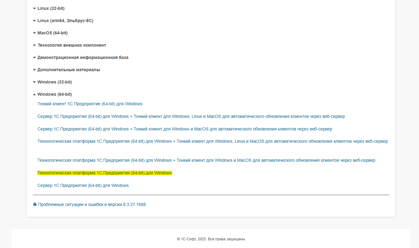 Переходим на сайт, авторизовываемся и выбираем версию платформы и нужную операционную систему, в нашем случае будет 8.3.27.1688 Windows 64-bit.