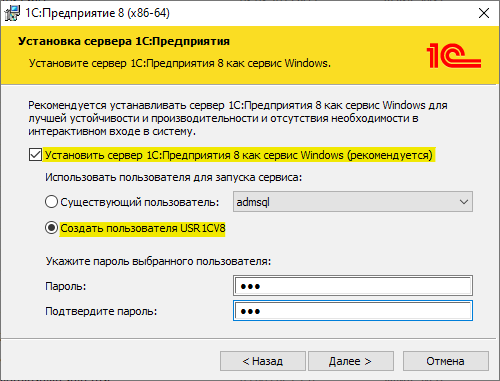 В большей части случаев сервер 1С:Предприятие устанавливается как служба, для этого рекомендуется создать отдельного пользователя, под которым будет работать эта служба. Чекбокс «Установить сервер 1С:Предприятие как сервис Windows (рекомендуется)» оставляем включенным, выбираем переключатель «Создать пользователя USR1CV8» и вводим пароль для него.