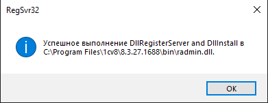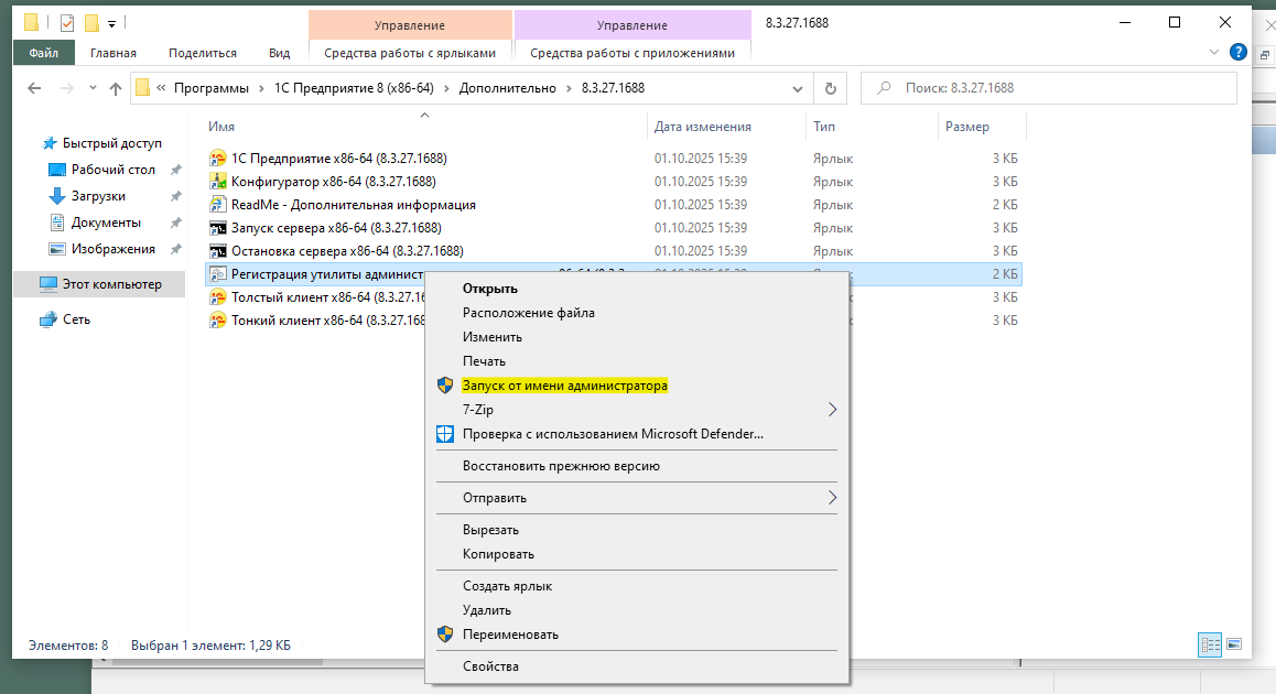 Далее требуется перейти по пути «C:\ProgramData\Microsoft\Windows\Start Menu\Programs\1C Предприятие 8 (x86-64)\Дополнительно\8.3.27.1688» и запустить файл от имени администратора «регистрация утилиты администрирования серверов». Путь может быть другой, если при установке указывался отличный от стандартного.