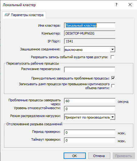 Интервал перезапуска – с помощью данного параметра можно установить частоту перезапуска рабочих процессов на кластере. Чаще всего используют для решения некоторых проблем с утечкой оперативной памяти в рабочих процессах, но автоматический перезапуск может приводить к разрыву соединений в активных сессиях. Поэтому в лучшем случае желательно проводить операции по перезапуску процессов и чистке кеша вручную, когда это необходимо.