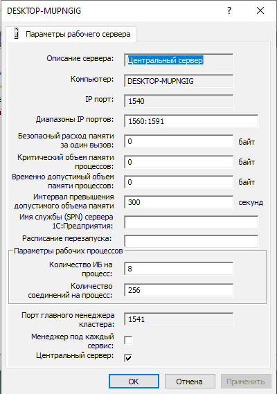 Безопасный расход памяти за один вызов - отдельные вызовы процедур не должны занимать всю оперативную память, выделенную рабочему процессу. Если параметр установлен в «0», то объем безопасного расхода ОЗУ будет равен 5 % от «Максимального объема памяти рабочих процессов». «1» – без ограничения, что крайне не рекомендуется. В большинстве случаев этот параметр лучше оставлять «0».
