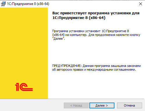 Запустится программа установки для 1С:Предприятие. Нужно нажать кнопку «Далее»