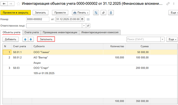 - инвентаризация финансовых вложений