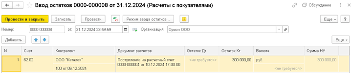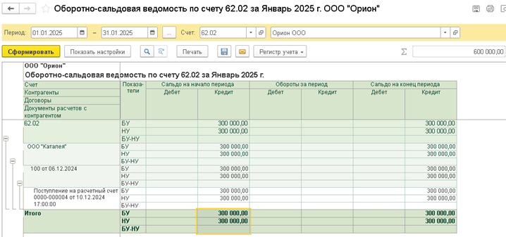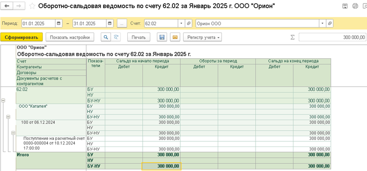 Используем отчет отчет Оборотно-сальдовая ведомость по счету (в примере счет 62.02) за первый день применения ОСН (в примере 01.01.2025) и установите флажки "БУ", "НУ", "БУ-НУ" для формирования списка покупателей, по которым следует ввести остатки в НУ по кредиторской задолженности (в виде полученных авансов) в НУ, сформируйте.
