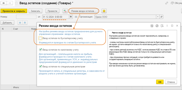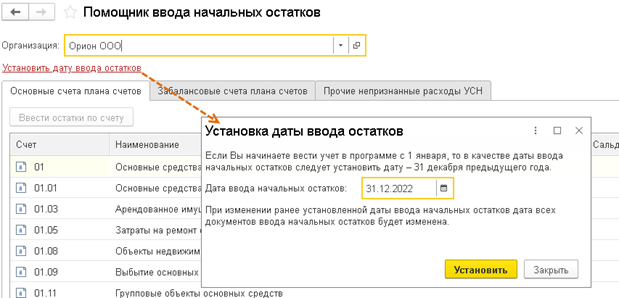 Если ранее вводились начальные остатки на дату начала учёта в программе (эту дату можно посмотреть под полем "Организация"), теперь для новых документов "Ввод остатков" установите дату перехода на ОСНО вручную — после снятия флажка "Ввод остатков по бухгалтерскому учёту".