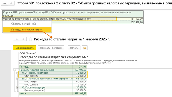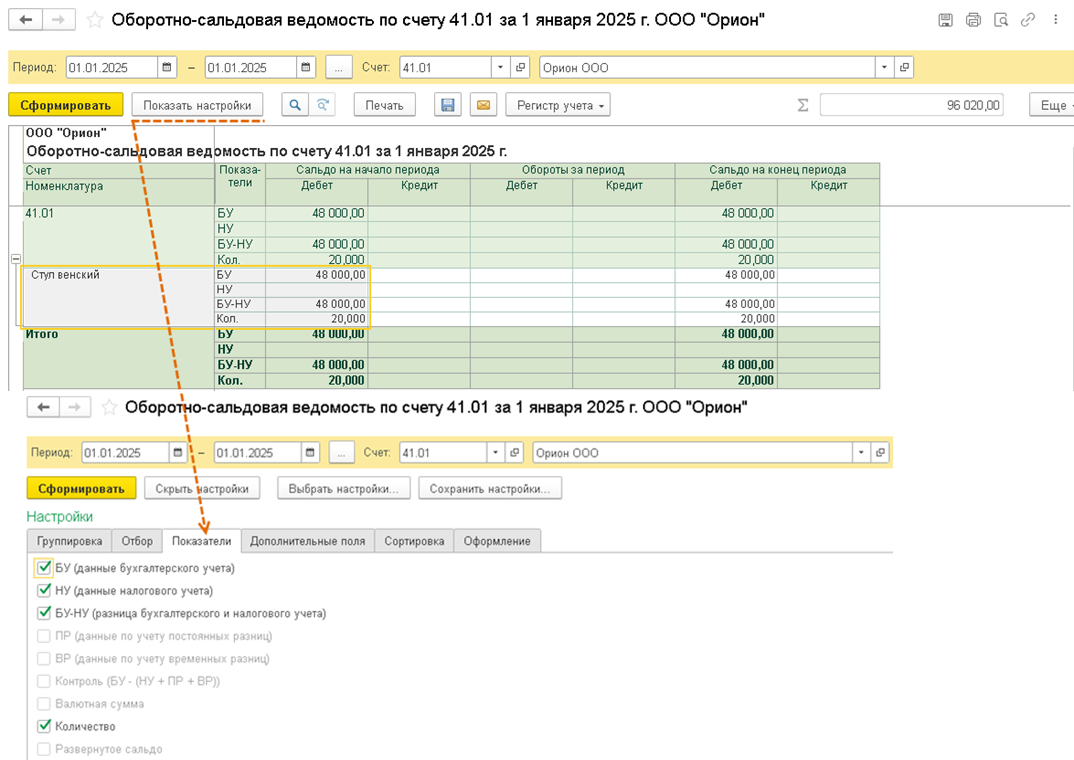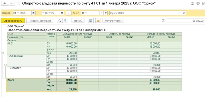 Для формирования списка товаров, по которым следует ввести остатки для целей налогового учета, сформируйте отчет Оборотно-сальдовая ведомость по счету (счет 41 "Товары") в разрезе субсчетов за первый день применения ОСН (в примере 01.01.2025). Если в программе ведется учет по складам, то отчет сформируйте в разрезе складов.