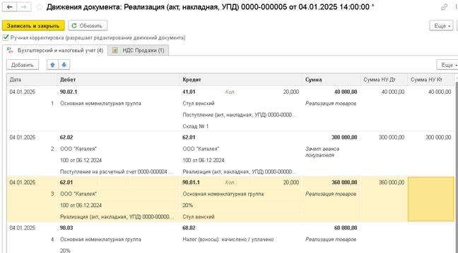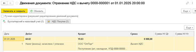 проверяем проведения документа - проводки только с суммами по налоговому учету (колонка "Сумма НУ Дт")